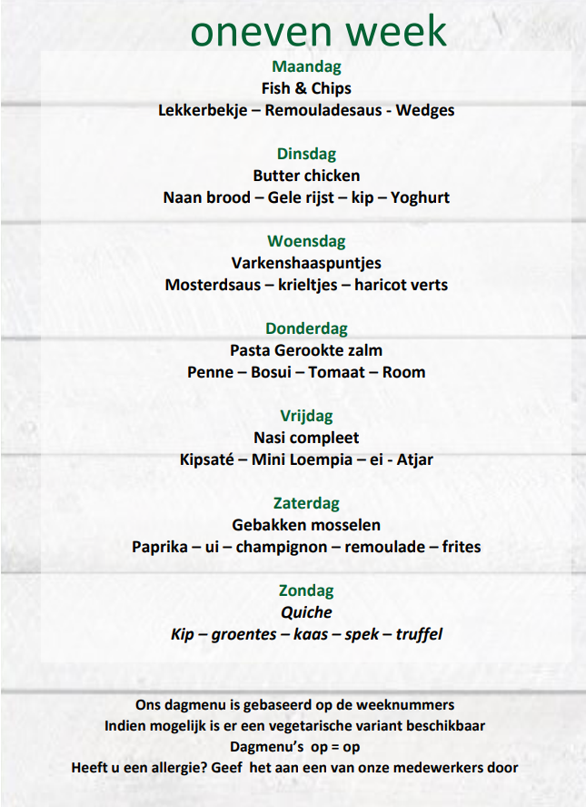 Is het een oneven week ( bijv, week 1,3,5 etc? dan kijkt u bij de desbetreffende dag op de oneven lijst, wat er vandaag op het menu staat!